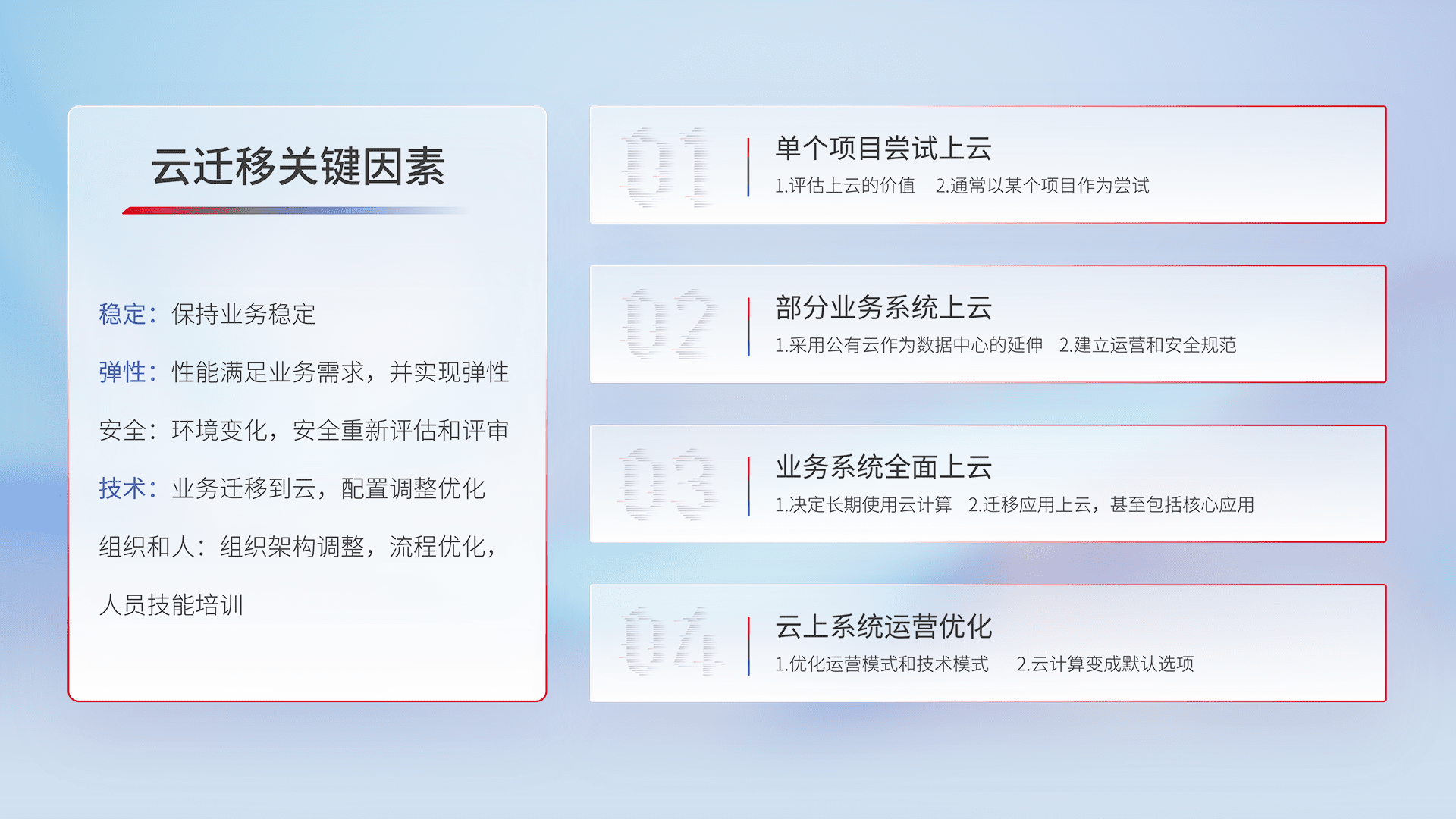 结合实际业务,,,从规划设计、、、、云平台选型、、云原生改造、、数据迁移、、、集成交付,,,迁移全过程为客户识别最佳上云路径,,,做好风险识别管理,,,设计网络架构、、身份权限、、安全审计合规、、、操作审计、、日志审计、、、监控告警策略、、多站点容灾设计等,,,对云上基础设施进行整体规划,,提升IT治理水平,,,,以满足弹性、、高可用、、、、高性能的需求。。
