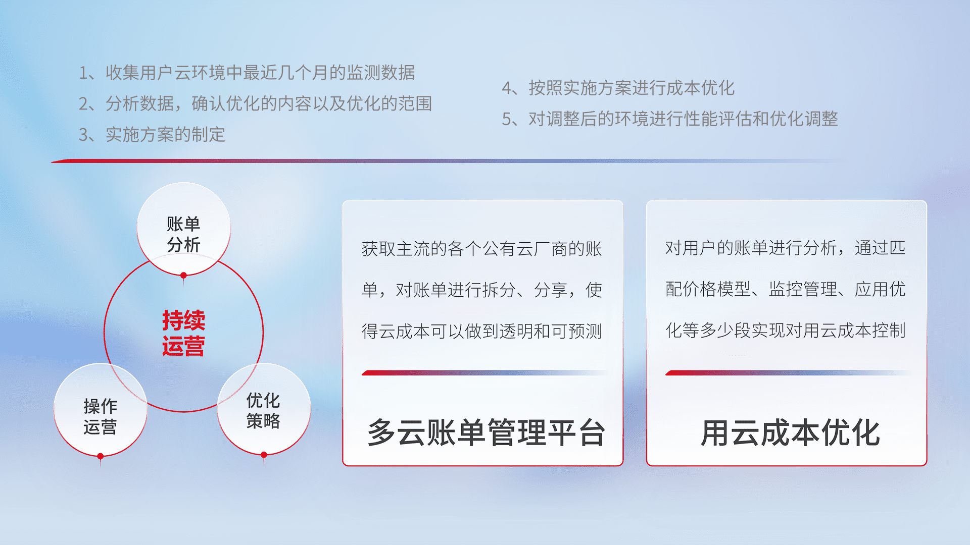 通过多云纳管,,,以统一的资源数据模型把客户的云资源进行抽象和封装,,,,进而实现对多云资源的统一操作,,,,保障云资源管理的可靠性、、稳定性与可用性。。。。量身定制化运维内容,,,配置、、开发运维、、、、补丁管理、、、备份、、、、监控、、认证和访问管理、、、、审计和日常巡检等,,,,保障在用云过程中的可靠度,,,,稳定度以及高可用率。。。。